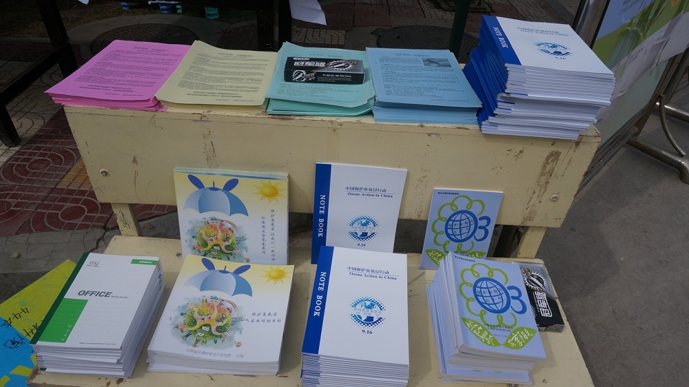 活动期间,进行了臭氧及臭氧层知识、《消耗臭氧层物质管理条例》、履约工作进展等内容的宣传展板展示。甘肃省环科院工作组成员和兰州大学地学行知会的同学一起,为同学们发放了包括《保护臭氧层,人类共同的目标》宣传册、《保护臭氧层五十问》宣传册、《善待臭氧,安享阳光》宣传彩页、《中国保护臭氧层行动》纪念笔记本等丰富多彩的宣传纪念品,并号召大家在“守臭氧蓝天屏障,捍绿茵大地之子”宣传条幅上签名留念以支持保护臭氧层活动。通过形式多样的宣传活动,使更多的大学生了解了臭氧层,了解了淘汰耗臭氧层物质相关法律法规,进一步增强了臭氧层保护意识。