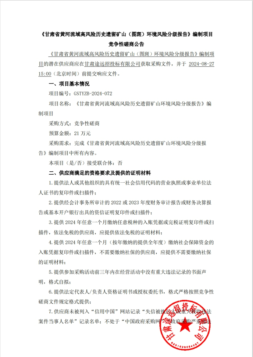 《甘肃省黄河流域高风险历史遗留矿山(图斑)环境风险分级报告》编制项目竞争性磋商公告